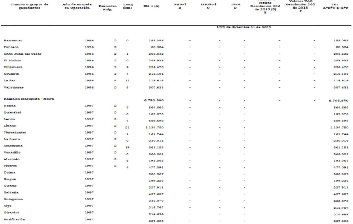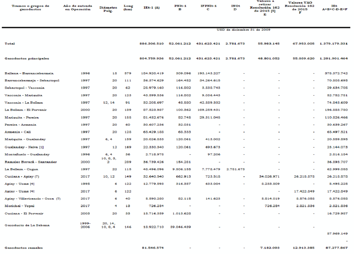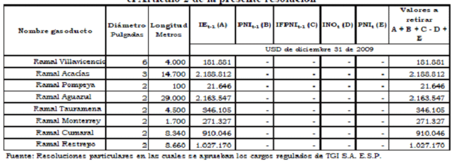 “Artículo 3o. Inversión Existente. Como inversión existente, IEt, se reconocen US$ 1.291.901.464 (dólares de diciembre 31 de 2009) para los gasoductos principales y US$ 87.277.867 (dólares de diciembre 31 de 2009) para los gasoductos ramales de acuerdo con la desagregación presentada en el Anexo 4 de esta resolución”.