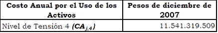ARTÍCULO 1o. COSTO ANUAL POR EL USO DE LOS ACTIVOS DEL NIVEL DE TENSIÓN 4. <Ver resoluciones que modifican esta resolución en Resumen de Notas de Vigencia> El Costo Anual por el Uso de los Activos del Nivel de Tensión 4 operados por la empresa Distribuidora del Pacífico S. A. E.S.P., calculado en la forma establecida en la Resolución CREG 097 de 2008, es el siguiente: