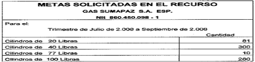 “Por lo anterior se solicita: sea revisado, analizado y evaluada la información reportada al SUI de la SSPD respecto a las compras y ventas de GLP por parte de Gas Sumapaz SA ESP., en el último año de operación, teniendo en cuenta que además se tienen dos plantas, tal como se puede constatar en los archivos de la Superintendencia, su participación en el mercado colombiano y regional y por ende lo que le correspondería en el actual parque universal de cilindros y se solicita respetuosamente las asignaciones de metas para el período de 1 de julio a 30 de septiembre de 2008 y de 1 de octubre de 2008 a 31 de diciembre de 2010, así: