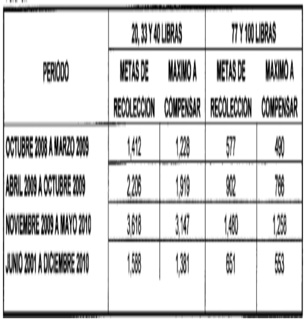 La distribución de estas metas en el tiempo se hizo de tal forma que al inicio del período de transición fueran más flexibles y se fueran concentrando hacia el intermedio del período. Así las metas se distribuyeron para ser ejecutadas en cuatro vigencias con la siguiente distribución del total estimado para recolectar en cada una de ellas, para la primera vigencia se tuvo en cuenta el 15% del parque total, para la segunda el 26%, para la tercera el 41% y para la cuarta el 18%.