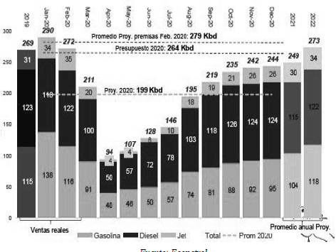 Las medidas adoptadas por el Gobierno nacional y los gobiernos locales para enfrentar la emergencia económica y social ocasionada por la pandemia del COVID-19 han afectado significativamente el consumo de hidrocarburos(1). En el Gráfico se presentan las ventas reales de gasolina, diésel y jet entre enero y abril de 2020, la proyección de demanda para el período mayo a diciembre del mismo año, así como para 2021 y 2022. Se proyecta que la demanda agregada de estos combustibles en mayo de 2020 corresponderá a un 40% de la demanda agregada promedio presupuestada este año.