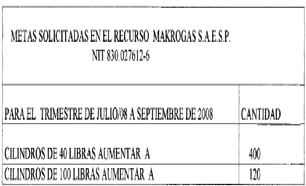 “Por lo anterior, se solicita sea revisado, analizado y evaluada la información reportada al SUI de la SSPD respecto a las compras y ventas de GLP por parte de MAKROGAS S.A. E.S.P. en el último año de operación, teniendo en cuenta además nuestra participación en el mercado colombiano y regional y por ende lo que le correspondería en el actual parque universal de cilindros y se solicita respetuosamente la aceptación al Recurso y las asignaciones de metas para el período del 1 de Julio de 2008 a 30 de Septiembre 2008 y del 1 de Octubre/08 a 31 de Diciembre/08 así: