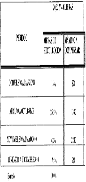 La distribución de estas metas en el tiempo se hizo de tal forma que al inicio del período de transición fueran más flexibles y se fueran concentrando hacia el intermedio del período. Así las metas se distribuyeron para ser ejecutadas en cuatro vigencias con la siguiente distribución del total estimado para recolectar en cada una de ellas, para la primera vigencia se tuvo en cuenta el 15% del parque total, para la segunda el 26%, para la tercera el 41% y para la cuarta el 18%.