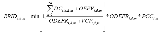 DCi,h,d,m: Disponibilidad Comercial de la planta i en la hora h del día d del mes m, expresado en kilovatios (kW), sin considerar la indisponibilidad respaldada mediante contratos de respaldo, declaraciones de respaldo o cualquier otro anillo de seguridad diferente a Subasta de Reconfiguración de Venta. Este respaldo debió registrarse previamente ante el ASIC. Para los contratos de mercado secundario cuando el precio de bolsa sea mayor que el precio de escasez se considerarán las cantidades despachadas de estos tipos de cubrimiento. Cuando no se cumpla la condición anterior, se considerará la cantidad registrada de estos tipos de cubrimiento. Para la DDV el cubrimiento se tendrá en cuenta cada vez que el generador active el mecanismo.