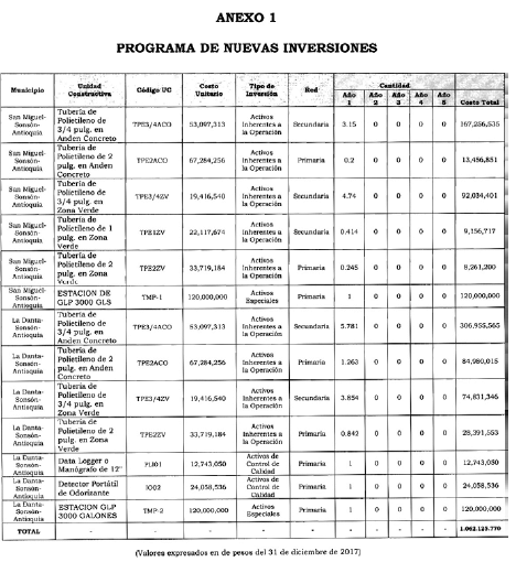 Respecto al plan de expansión es importante considerar que mediante la Resolución CREG 185 de 2011, se aprobó el Cargo Promedio de Distribución por uso del Sistema de Distribución con base en la metodología de costos medios de mediano plazo, establecida en la Resolución CREG 011 de 2003. Donde, para el mercado relevante conformado por el municipio de Sonsón se aprobó un cargo de distribución con base en un programa de nuevas inversiones a cinco años.