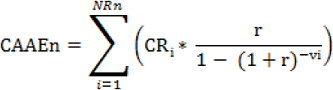 | CAAEi: | Costo anual equivalente del activo eléctrico i construido por el prestador de la actividad, calculado de acuerdo con la metodología del numeral 21.1 del artículo 21 de la presente Resolución, en pesos constantes. |