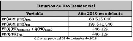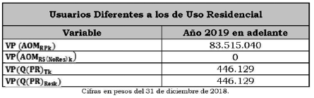 Aplicando la metodología contenida en la Resolución CREG 202 de 2013 y aquellas que la modifican, adicionan o sustituyan, se calcularon las siguientes variables principales para la componente que remunera los gastos de AOM, aplicable a usuarios de uso residencial y a usuarios diferentes a los de uso residencial: