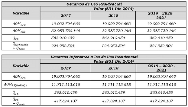 Aplicando la metodología contenida en la Resolución CREG 202 de 2013 y sus modificaciones y adiciones, se calcularon conforme a las fórmulas establecidas en los numerales 9.1.1.1. y 9.2.1.1. del artículo 9o para la componente que remunera los gastos de AOM, aplicable a usuarios de uso residencial y a usuarios diferentes a los de uso residencial, las siguientes variables principales:
