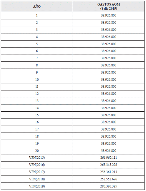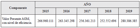 ARTÍCULO 4o. GASTOS DE ADMINISTRACIÓN, OPERACIÓN Y MANTENIMIENTO (AOM). <Resolución derogada por el artículo 10 de la Resolución 502-51 de 2023> El nivel de eficiencia obtenido del modelo de optimización es del 100% Aplicando este resultado al valor presente de los gastos de AOM propuestos para el Horizonte de Proyección, se obtiene el siguiente valor $266.960.111. La comparación del porcentaje resultante de la relación del valor presente neto de la proyección de gastos de AOM de distribución, el procedimiento definido en la Resolución CREG 202 de 2013, la mediana de los mercados existentes de distribución de todo el país y conforme al crecimiento de la proyección de la demanda, determinan que el valor presente de los gastos de AOM para el Horizonte de Proyección y para incorporar al cálculo del cargo que remunera los gastos de AOM es el siguiente. En el Anexo 3 se presentan los gastos de AOM para cada año del el Horizonte de Proyección: