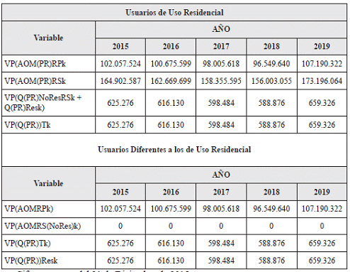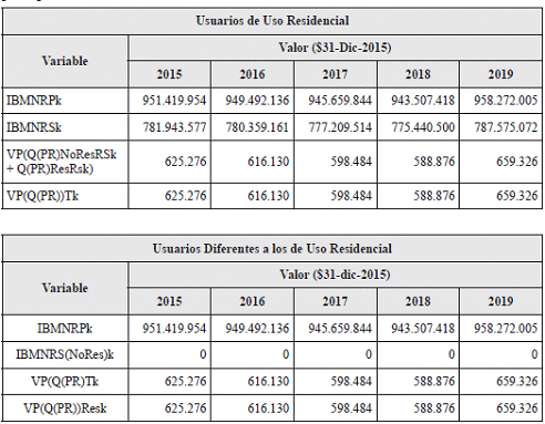 Aplicando la metodología contenida en la Resolución CREG 202 de 2013 y sus modificaciones y adiciones, se calcularon conforme a las formulas establecidas en los numerales 9.1.1.3. y 9.2.1.3. del artículo 9o para la componente que remunera los gastos de AOM, aplicable a usuarios de uso residencial y a usuarios diferentes a los de uso residencial, las siguientes variables principales: