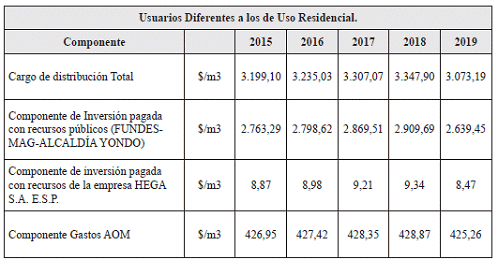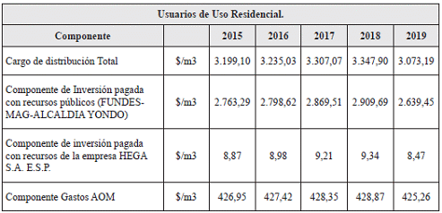 La Comisión de Regulación de Energía y Gas en sus actos administrativos particulares realiza la discriminación de los cargos de distribución el valor correspondiente a la componente de inversión financiada con recursos públicos y el que corresponde a la componente de inversión de recursos propios de la empresa, de tal manera que la primera sea fácilmente identificable, para no ser cobrada en la tarifa a los usuarios por parte del prestador del servicio.