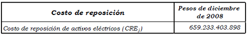 Artículo 4o. Costo de Reposición de los Activos Eléctricos. El costo de reposición de los activos eléctricos (CREG) remunerados mediante cargos por uso a Transelca S. A. ESP, calculado con la base de activos a la que hace referencia el artículo 3o de la presente Resolución y de acuerdo con lo señalado en la Resolución CREG 011 de 2009 es: