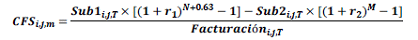 Donde la variable CFSi,j,m corresponderá a la remuneración por el costo financiero asociado al giro de los subsidios al comercializador deficitario i, en el mercado de comercialización j, en el mes m. Esta variable será estimada mensualmente por el comercializador de conformidad con la siguiente fórmula: