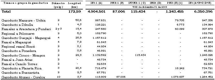[1] El valor de PNI indicado en el Anexo 2 de la Resolución CREG 117 de 2011 se asignó a cada ramal a prorrata de su longitud, excepto en el gasoducto Atunes - Corelca.