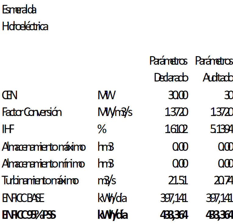 Los siguientes son los resultados del informe de verificación de parámetros de PwC AG sobre la planta y/o Unidad de Generación ESMERALDA, los cuales le permiten expresar que el valor reportado para el parámetro de Indisponibilidad Histórica Forzada Planta Hidraúlica - IHF, presenta una discrepancia: