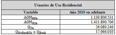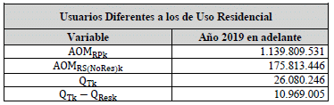 Aplicando la metodología contenida en la Resolución CREG 202 de 2013 y sus modificaciones y adiciones, se calcularon conforme a las fórmulas establecidas en los numerales 9.1.1.1. y 9.2.1.1. del artículo 9° para la componente que remunera los gastos de AOM, aplicable a usuarios de uso residencial y a usuarios diferentes a los de uso residencial, las siguientes variables principales: