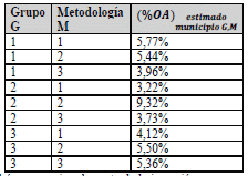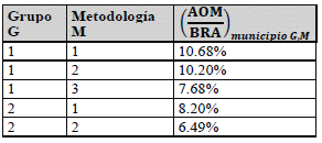 | Código DANE Municipio | Municipio | Departamento | Grupo G | Metodología M |