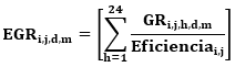 | Energía equivalente que generaría la unidad o planta de generación i del generador j con el gas en caso de no haber sido negociado y/o racionado en el día d del mes m. |