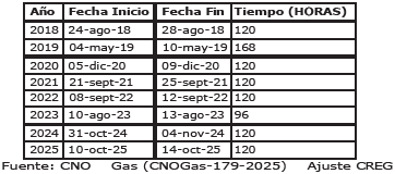 Lo anterior, toda vez que la duración permisible para suspensiones del servicio en infraestructura del SNT se lleva a cabo en horas discontinuas, (ejemplo de esto es la información que se puede consultar sobre Operatividad del Mercado del numeral 5 del Informe Anual del Mercado de Gas del Gestor del Mercado de Gas Natural para el año 2023), mientras que en el caso de infraestructuras de regasificación se lleva a cabo en horas continuas y por lo general en un solo momento del año. Ejemplo de esto es el histórico de estos mantenimientos, como se muestra a continuación: