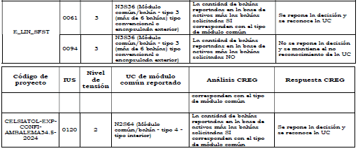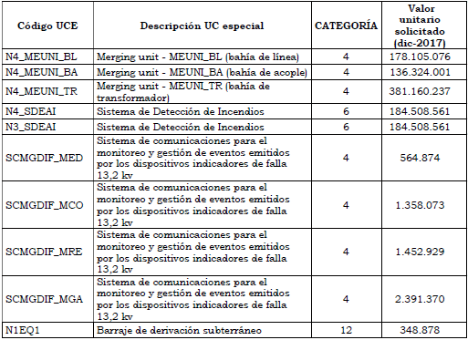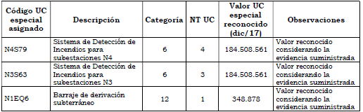 En lo que respecta a estas UC especiales, luego del análisis de la Comisión se concluye que cuentan con características técnicas distintas a las establecidas en el capítulo 14 del Anexo General de la Resolución CREG 015 de 2018, y por lo tanto la Comisión decide reponer la decisión y dar reconocimiento a estas UC especiales dentro del plan de inversión aprobado en la Resolución CREG 501 041 de 2024. La siguiente tabla presenta el código asignado a cada una de estas UC especiales junto a su valoración y consideraciones: