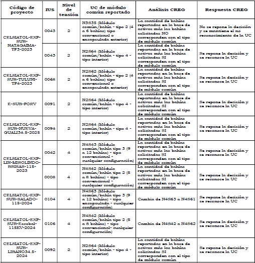 Para los módulos comunes, la CREG manifiesta que las bahías relacionadas no corresponden a la UC reportada, sin embargo, la asimilación de la unidad constructiva realizada por CELSIA COLOMBIA se ajusta a lo indicado en los literales “j”, “k”, “m” y “o” del numeral 14.1 de la Resolución CREG 015 de 2018, ya que se considera la totalidad de las bahías de la Subestación al momento de definir el tipo de módulo común:
