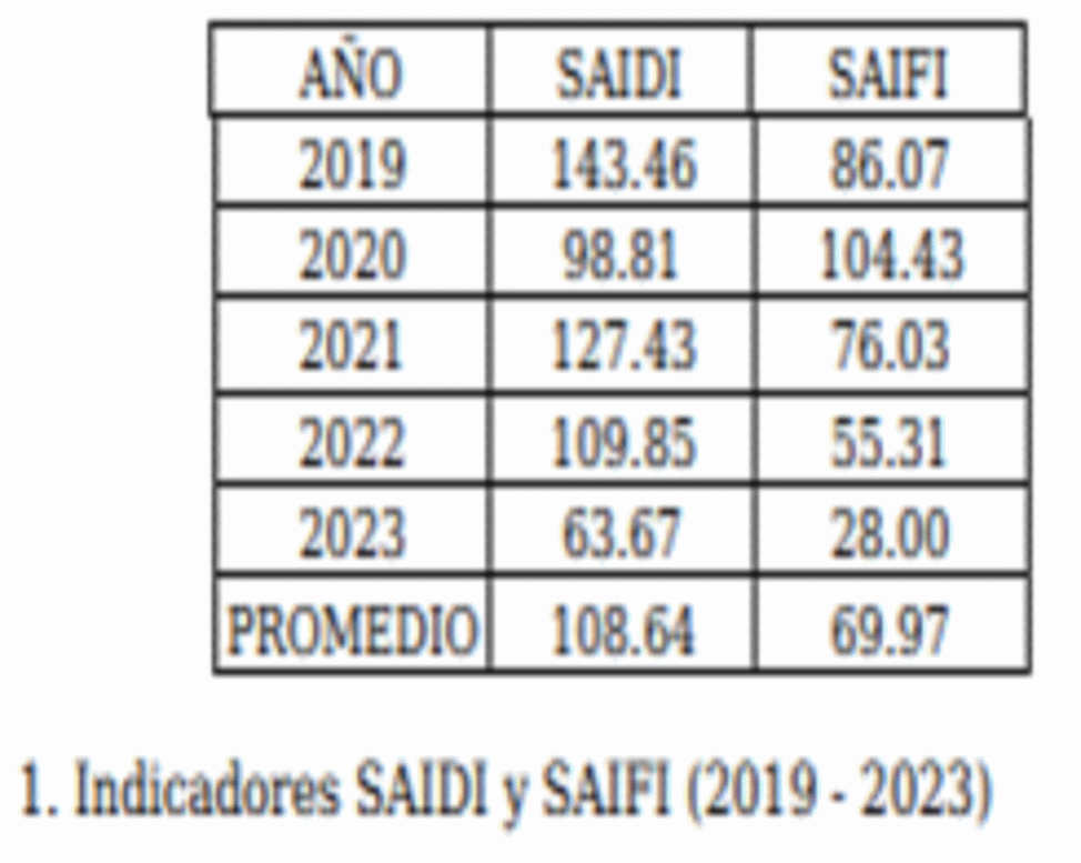 Mejora en el periodo: Como se puede observar el promedio de los valores reportados de SAIDI y SAIFI entre 2019 y 2023 es inferior al valor registrado en el primer año (2019), lo que demuestra una reducción sostenida en las interrupciones del servicio.