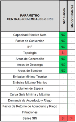- La serie Menor Calderas declarada, refleja los aportes provenientes del trasvase Tafetanes. El manejo dado a la serie Menor Calderas, es el resultado de simplificaciones realizadas para adaptar el modelo HIDENFICC a las condiciones particulares de la Topología de la central San Carlos, que han sido validadas por la CREG y XM en todos los procesos de asignación de OEF.
