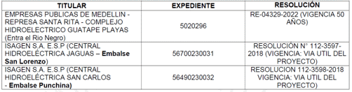 También vale la pena informar que, dicho proyecto se encuentra actualmente autorizado a través de Resolución 112-0051 del 19 de noviembre de 2002, a través de la cual se otorgó una concesión de aguas para la generación de energía eléctrica a los Empresas Públicas de Medellín, con NIT 890.904.996-1, a derivar del Río Negro.- Nare, para la represa Santa Rita en el Municipio de Alejandría, departamento de Antioquia, la cual es objeto de control y seguimiento por parte de Cornare. Lo anterior, debido a que el instrumento ambiental inicial, se encontraba vencido desde el año 1978.”
