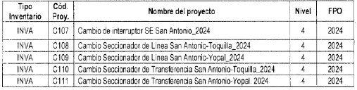 Respecto a los proyectos definidos por ENERCA S. A. E.S.P., y presentados en la actualización del plan de inversiones (Vigencias 2023-2027), destacan los identificados con código C 107, C 108, C 109, C 11 O y C 111 (listados a continuación'); los cuales pretenden intervenir los activos representados por ENERCA en la Subestación San Antonio 115kV que es Administrada Operada y Mantenida por el agente del mercado: Empresa de Energía de Boyacá - EBSA S. A. E.S.P.
