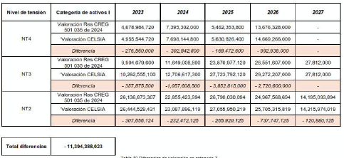 CELSIA COLOMBIA replicó el cálculo de la valoración de unidades constructivas realizada por la Comisión sin presentar diferencias sustanciales en las diferentes categorías, salvo por una discrepancia en la categoría 6 del año 2023 para el nivel de tensión 3, y en la categoría 7, siendo esta última motivo de especial preocupación, y evidencia un error en la valoración realizada para la consolidación del plan aprobado, para lo cual soportamos las diferencias encontradas en la siguiente tabla: