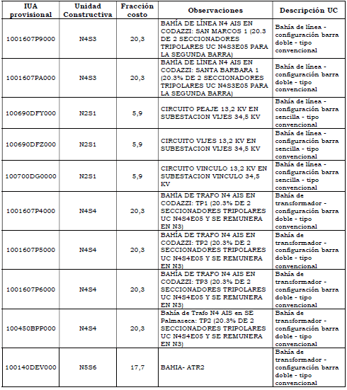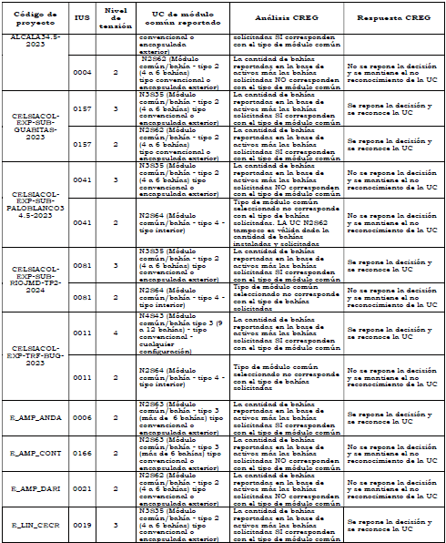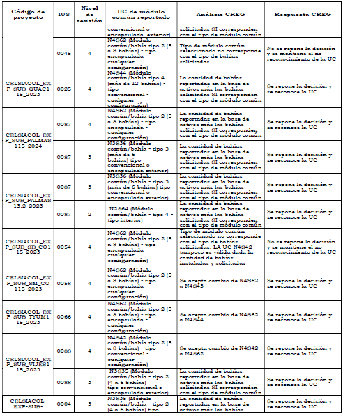 Considerando lo expuesto, la Comisión identificó inconsistencias en los valores presentados en la Resolución CREG 501 035 de 2024, los cuales serán ajustados. Se destaca que esta tabla no considera UC especiales reconocidas, además, es informativa y no corresponde a las inversiones reconocidas por la Comisión.