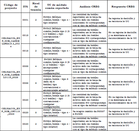 Para los módulos comunes, la CREG manifiesta que las bahías relacionadas no corresponden a la UC reportada, sin embargo, la asimilación de la unidad constructiva realizada por CELSIA COLOMBIA se ajusta a lo indicado en los literales 'T', “k”, “m” y “o” del numeral 14.1 de la Resolución CREG 015 de 2018, ya que se considera la totalidad de las bahías de la Subestación al momento de definir el tipo de módulo común: