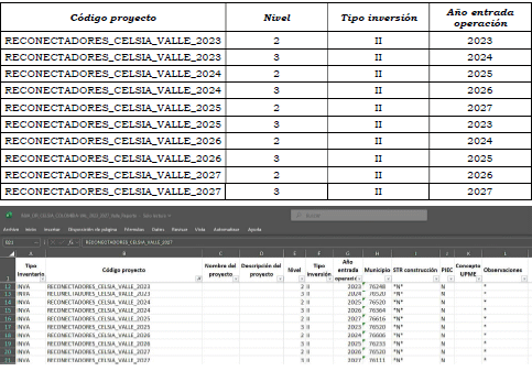 Dicho esto, la eliminación de duplicidad en los códigos de los proyectos se realizó con el objetivo de evitar la duplicación de los activos relacionados, dado que los aplicativos utilizados por la Comisión para la valoración del inventario no pueden recibir un mismo código de proyecto para hacer referencia a proyectos distintos, por ejemplo, con año de entrada en operación o nivel de tensión distinto.