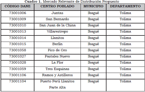 Por la cual se aprueba el Mercado Relevante Especial de Distribución de Gas Licuado de Petróleo (GLP) por redes de tubería conformado por los Centros Poblados de Berlín, Juntas, La Flor, Llanitos, Pastales Nuevo, Pico de Oro, Puerto Perú Llanitos Parte Alta, Ramos y Astilleros, San Bernardo, San Juan de la China, Tres Esquinas y Villarestrepo en el Municipio de Ibagué, Departamento de Tolima; así como el Cargo de Distribución por uso del Sistema de Distribución y el Componente Fijo del Costo de Comercialización para el mercado, según solicitud tarifaria presentada por la empresa GAS UNIÓN DE COLOMBIA S. A. S. E.S.P.