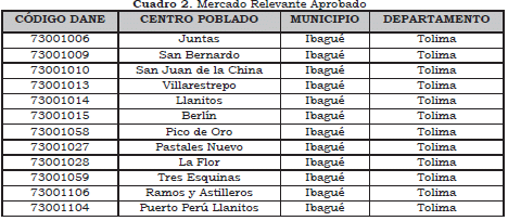 ARTÍCULO 1o. MERCADO RELEVANTE DE DISTRIBUCIÓN PARA EL SIGUIENTE PERÍODO TARIFARIO. Conforme a lo definido en el numeral 5.3 del artículo 5o de la Metodología contenida en la Resolución CREG número 202 de 2013, en concordancia con las Resoluciones 138 de 2014, 090 y 132 de 2018, y 011 de 2020, se aprueba el Mercado Relevante de Distribución para el siguiente período tarifario correspondiente a un Nuevo Mercado Relevante de Distribución Especial conformado por los siguientes centros poblados: