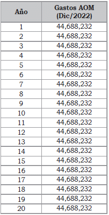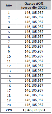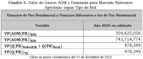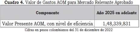 ARTÍCULO 10. GASTOS AOM. Los gastos de AOM ajustados con base en los cuales se determinó el Componente Fijo aprobado en el artículo 8o de la presente Resolución se presentan en el Anexo número 5. El valor presente de los gastos de AOM con nivel de eficiencia determinado es $59,088,232 (pesos colombianos del 31 de diciembre de 2022).