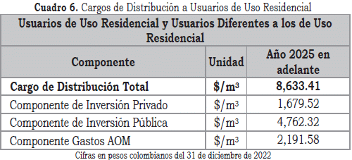 ARTÍCULO 6o. VIGENCIA DE LOS CARGOS DE DISTRIBUCIÓN APLICABLES A LOS USUARIOS DE USO RESIDENCIAL Y A USUARIOS DIFERENTES A LOS DE USO RESIDENCIAL. Los Cargos de Distribución aplicables a los Usuarios de Uso Residencial y a los Usuarios Diferentes a los de Uso Residencial estarán vigentes por un término de cinco (5) años contados desde la fecha en que quede en firme la presente Resolución. Vencido el período de vigencia de los cargos regulados, estos continuarán rigiendo hasta que la Comisión apruebe los nuevos, tal como está previsto en el artículo 126 de la Ley 142 de 1994, modificado por el artículo 52 de la Ley 2099 de 2021.