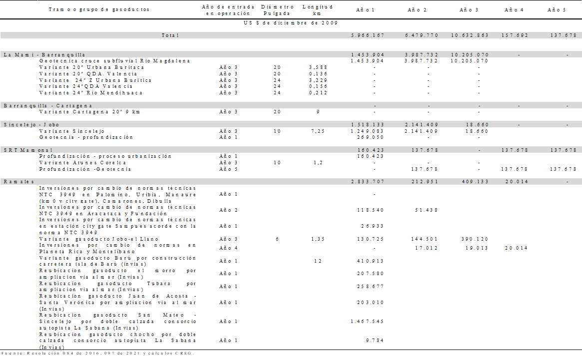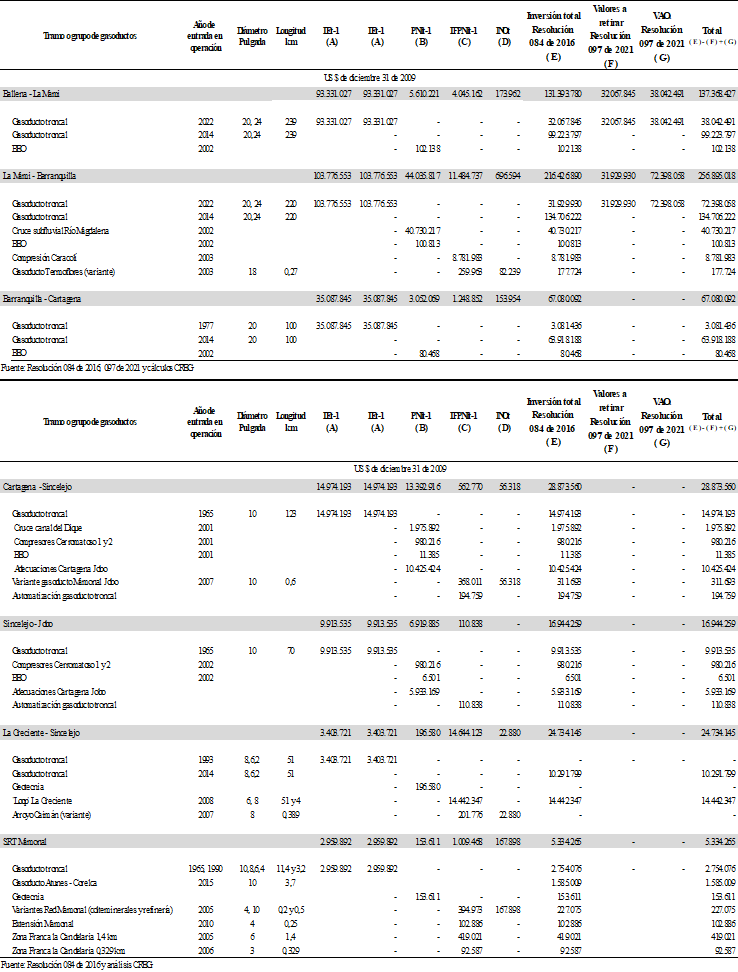“Artículo 3. Inversión existente. Como inversión existente, IEt, se reconocen US $ 537.229.766 (dólares de diciembre 31 de 2009) para los gasoductos principales y US $ 189.744.853 (dólares de diciembre 31 de 2009) para los gasoductos ramales de acuerdo con la desagregación presentada en el anexo 1 de esta resolución.”