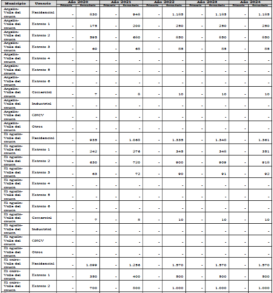 La empresa OP&S CONSTRUCCIONES S. A. E. S. P. cuenta con cargos de distribución transitorios aprobados mediante las Resoluciones CREG 147 de 2016(2) para el mercado relevante conformado por los municipios de Dagua, La Cumbre y Restrepo en el departamento del Valle del Cauca y mediante Resolución CREG 042 de 2018(3) para el mercado relevante conformado por los municipios de Argelia, El Águila y El Cairo en el departamento del Valle del Cauca.