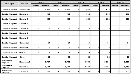 Dado que el sistema de distribución presentado por las empresas CSP SOSTENIBLES S.A. E.S.P. y ZOMAC S.A.S. E.S.P. para el mercado relevante conformado por los municipios de Curillo y El Doncello en el departamento de Caquetá cuenta con red primaria y secundaria, pero todos sus usuarios están conectados a la red secundaria, se determinará para este mercado relevante un único cargo de distribución que será aplicable a los usuarios de uso residencial y usuarios diferentes al uso residencial. Lo anterior, conforme a lo establecido en el Numeral 9.3 del Artículo 9 de la Resolución CREG 202 de 2013 y en concordancia con las resoluciones CREG 138 de 2014, 090 y 132 de 2018, y 011 de 2020: