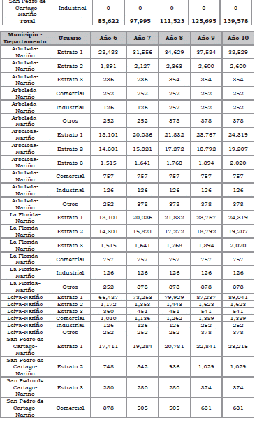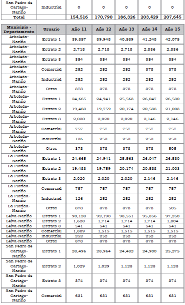 ARTÍCULO 11. APLICACIÓN DEL CARGO. Las empresas prestadoras de servicios públicos domiciliarios debidamente constituidas y registradas en el SUI como comercializadoras de gas combustible, que decidan prestar el servicio público domiciliario de Gas Licuado de Petróleo (GLP), por redes, a usuarios regulados del Mercado Relevante conformado por los municipios de Arboleda, La Florida, Leiva y San Pedro de Cartago en el departamento de Nariño, deberán aplicar el Componente Fijo de Comercialización aprobado en el artículo 8o de este mismo acto administrativo.