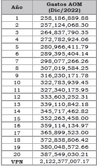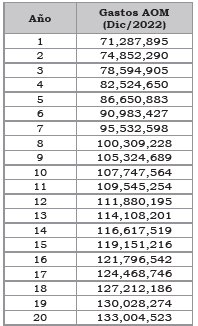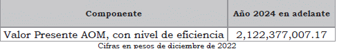 ARTÍCULO 10. GASTOS AOM. Los gastos de AOM ajustados con base en los cuales se determinó el Componente Fijo aprobado en el artículo 8o de la presente resolución se presentan en el Anexo 5. El valor presente de los gastos de AOM con nivel de eficiencia determinado es $ 101,200,495.33 ($ de diciembre de 2022).