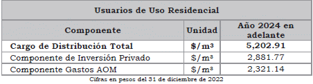 ARTÍCULO 5o. CARGO DE DISTRIBUCIÓN APLICABLE A LOS USUARIOS DE USO RESIDENCIAL Y USUARIOS DIFERENTES A LOS DE USO RESIDENCIAL. A partir de la vigencia de la presente resolución, el Cargo de Distribución aplicable a los usuarios de uso residencial y a usuarios diferentes a los de uso residencial en el Mercado Relevante definido en el artículo 1o para recuperar los costos de inversión y los gastos de AOM para la distribución domiciliarios de gas combustible por redes de tuberia se fija de la siguiente manera: