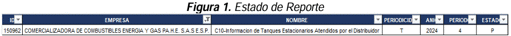 “Para atender su solicitud, la Dirección Técnica de Gestión de Gas Combustible (DTGGC), inicialmente considera importante informar que en primer lugar, como respuesta a la solicitud de la CREG, mediante el radicado SSPD No. 20245295703382 del 27 de diciembre del 2024, la información sobre los tanques estacionarios atendidos por cada distribuidor y su capacidad en galones correspondiente al año 2024, se remitió por parte de la DTGGC, en el oficio con radicado SSPD No. 20252320143291 del 20 de enero del 2025, con corte al 16/01/2025, se informó en el anexo 2 Información de tanques estacionarios en el libro denominado 3 Estado_reporte_SUI, que este prestador, tenía habilitado el formato y en estado (P=Pendiente), como se ilustra en la Figura 1.