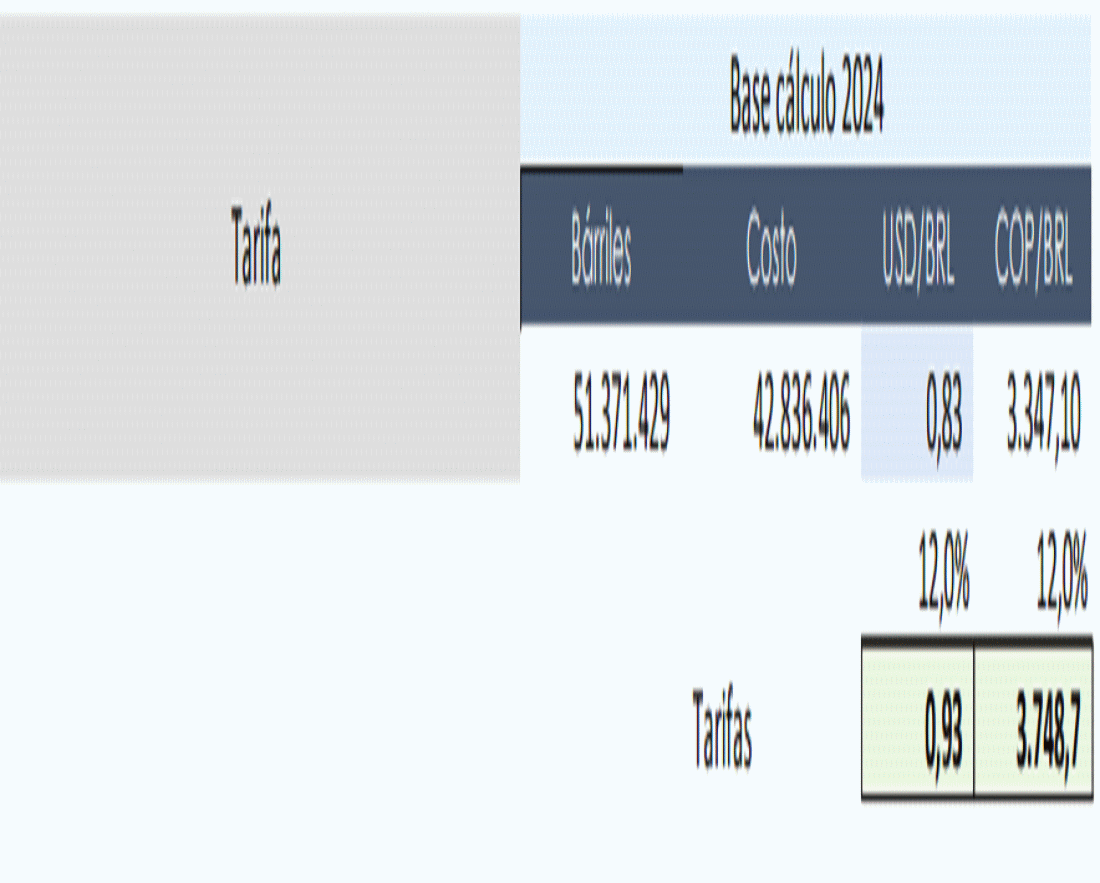 Al hacer el ejercicio con estas premisas, el resultado de la tarifa es de 0,93 USD/BL, que es el costo de la prestación del servicio de entregas locales para REFINERÍA DE CARTAGENA por el mantenimiento, operación y medición en el bombeo de los productos terminados para la entrega local a PETROMIL, el cual está constituido de la siguiente manera: