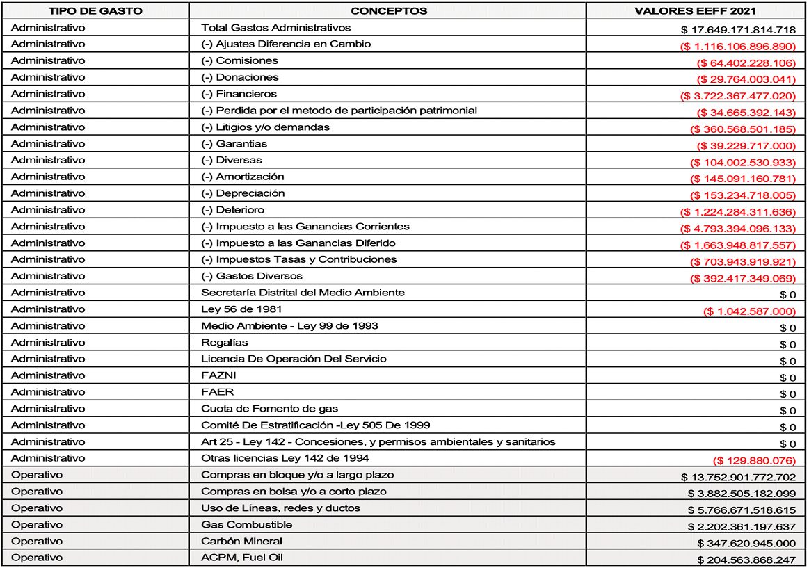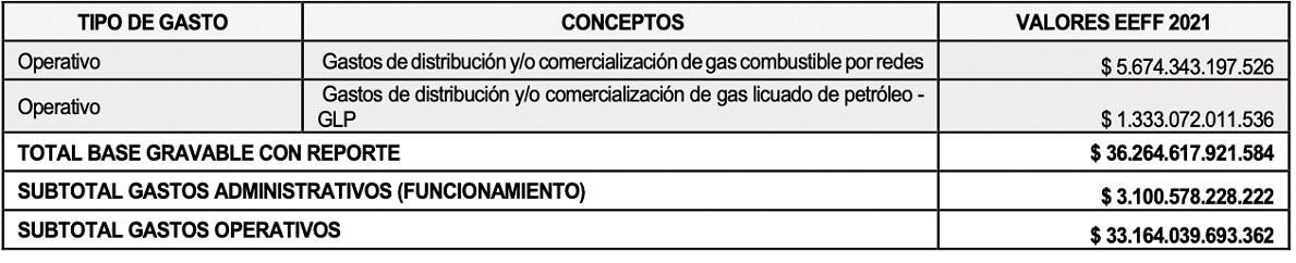 Para cubrir dicho faltante, del total de gastos operativos ($33.164.039.693.362) se tomaron únicamente $189.822.259.178, (es decir, un 0,5723738% sobre el total de los gastos operativos reportados), valor que multiplicado por la tarifa del 1% da como resultado la porción del faltante de contribución especial 2022 por $1.898.222.592 (es decir, 0,0057237% del total de gastos operativos reportados), esta es por lo tanto, la proporción indispensable para cubrir el faltante presupuestal 2022 de la CREG, en los términos establecidos en el parágrafo 2 del artículo 85 de la Ley 142 de 1994, y fueron incluidos en la base gravable de la contribución especial de la vigencia 2022, como se detalla a continuación: