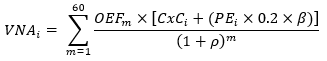 iii) Se calcula el valor presente neto de los sesenta (60) pagos mensuales (VNAi) con el Cargo por Confiabilidad inicial que es el resultado del producto mensual de las OEF (MWh/mes) por el Cargo por Confiabilidad asignado originalmente (USD/MWh) más los pagos de las compras en bolsa a precio de escasez. Este valor presente neto se descuenta con una tasa (ñ) del 0.7783% mes, es decir se aplica la siguiente ecuación: