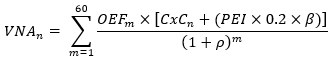iv) Se plantea el valor presente de los sesenta (60) pagos mensuales (VNAn) con el Cargo por Confiabilidad asociado al precio de escasez inferior, como el valor presente neto de los productos mensuales de las OEF (MWh/mes) por el Cargo por Confiabilidad asociado al precio de escasez inferior (USD/MWh) más el valor de las compras en bolsa con el precio de escasez inferior, asumiendo nuevamente que el 20% de la OEF (MWh/mes) para los últimos veinticuatro (24) meses se compran en bolsa, con una tasa de descuento (ñ) del 0.7783% mes, es decir: