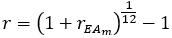 | Tasa de interés a trasladar al usuario por los comercializadores. Esta variable debe corresponder a la tasa de interés efectivamente incurrida sin que, en ningún caso, supere la tasa de interés preferencial de los créditos comerciales vigentes de las últimas tres (3) semanas disponibles a la fecha de expedición de la La fuente de información de la Tasa Preferencial En el caso de existir líneas de financiación creadas por el Gobierno Nacional para estos efectos, la tasa r a transferir a los usuarios corresponderá a la tasa de estas líneas de financiación, así la empresa no tome dicha financiación. La tasa efectiva anual publicada deberá calcularse de manera mensual, para su aplicación, utilizando la siguiente expresión: Donde: r: Tasa mensual a aplicar en el mes m. rEAm: Tasa efectiva anual para calcular la tasa mensual a aplicar en el mes m. | |
