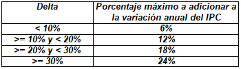 | Porcentaje de variación mensual, por tipo de usuario k, que aplicará el Comercializador j sobre el componente Variable del Costo Unitario de Prestación del Servicio Público de Gas Combustible por Redes de Tubería. Este será definido por cada Comercializador y podrá cambiar de un mes a otro, pero deberá asegurarse de que i. Podrá tener valores negativos. ii. Durante los cuatro (4) primeros meses no podrá superar el cero por ciento (0%). iii. El PV acumulado de los primeros doce (12) meses no podrá superar la variación anual del Índice de Precios al Consumidor, IPC al 31 de diciembre del año inmediatamente anterior al mes de cálculo. iv. El PV acumulado anual en cada año de aplicación de la Opción, después de transcurridos los primeros doce (12) meses, no podrá ser superior a la variación anual del Índice de Precios al Consumidor, IPC, al 31 de diciembre del año inmediatamente anterior al mes de cálculo más el 6.0%. v. El PV acumulado durante el año 2023 con corte al mes de enero de 2024 no podrá superar el porcentaje de variación del Índice de Precios al Consumidor IPC, ocurrido entre diciembre del año 2021 y diciembre del año 2022. vi. A partir del mes de enero de 2024 el PV acumulado podrá alcanzar como máximo los porcentajes que se establecen a continuación: ![]() El valor de Delta de cada mercado se obtendrá, por una sola vez, con base en el siguiente cálculo: Delta = Donde: m-1: corresponde al mes de diciembre de 2023. k: tipo de usuario residencial que para efecto de cálculo corresponde al estrato 1. Las empresas comercializadoras podrán aplicar porcentajes de incremento mensuales de modo que el porcentaje anual acumulado pueda ser igual o inferior al obtenido de acuerdo con la tabla precedente. Para efectos de cumplir con lo dispuesto, las empresas comercializadoras deberán tener en cuenta que el porcentaje de incremento PV anual se establece, para cada mes de aplicación, de la siguiente manera: Porcentaje de Incremento PV anual = | |